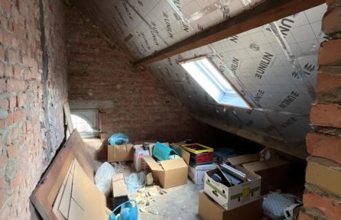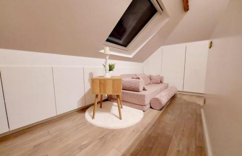 een zolder werd van vloer tot plafond aangepakt en afgewerkt eerst werd een trap gezet, dan muren + plafond en vloerafwerking als kers op de taart werden ook heel wat ingemaakte kasten geplaatst