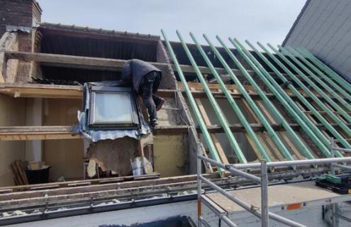 Het doel was om de golfplaten veilig te verwijderen en het dak de nodige aanpassingen te geven zodat pannen geplaatst kunnen worden en er langs de binnenzijde in een latere fase kon geïsoleerd worden. De aanwerking met de buren hun leien dak en de vrijstaande zijkanten werden mooi aangewerkt en waterdicht gemaakt. Alle goten werden tijdens de werken ook vervangen.